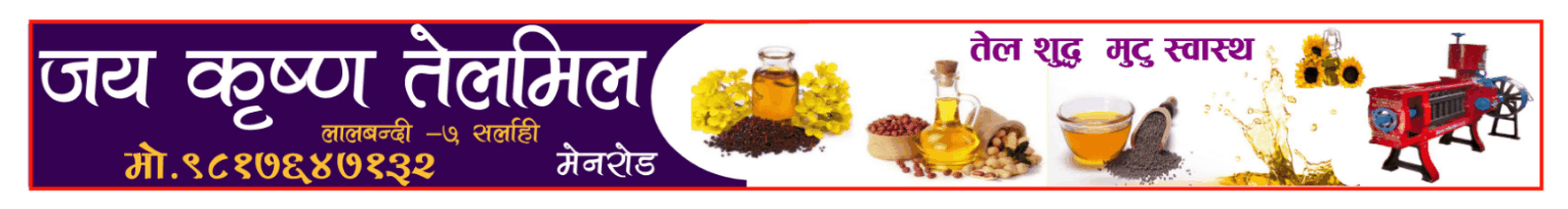 Home Advertisement Adbar-4 jay krishna oil mill -ad AdvertisementAdbar-4 jay krishna oil mill -ad By चियोचर्चो खबर - July 24, 2025 0 FacebookTwitterPinterestWhatsApp RELATED ARTICLESMORE FROM AUTHOR Adbar-4 lalbandi e-2082-8-5 Adbar-1 नगद १४ लाखसहित पर्साबाट दुई जना पक्राउ Adbar-4 jay krishna oil mil -ad- भरखरै प्राप्त नेपाली कांग्रेसको जनकपुर ‘प्रतिज्ञा सभा’को तयारी पूरा, एक लाख सहभागिता हुने... February 17, 2026 हत्याको विरोधमा अदालतका कर्मचारीले गरे, सेवा प्रवाह बन्द गरि विरोध प्रदर्शन February 16, 2026 पूर्वाधार विकास कार्यालय सर्लाहीका इन्जिनियर प्रमोद यादवको गोली हानेर हत्या February 15, 2026 जसपा र लोसपाका केन्द्रीय नेताहरू कांग्रेसमा प्रवेश, तराईमा कांग्रेस झन बलियो... February 14, 2026 लालबन्दीमा आज ८ घण्टा विद्युत् आपूर्ति बन्द हुने February 14, 2026