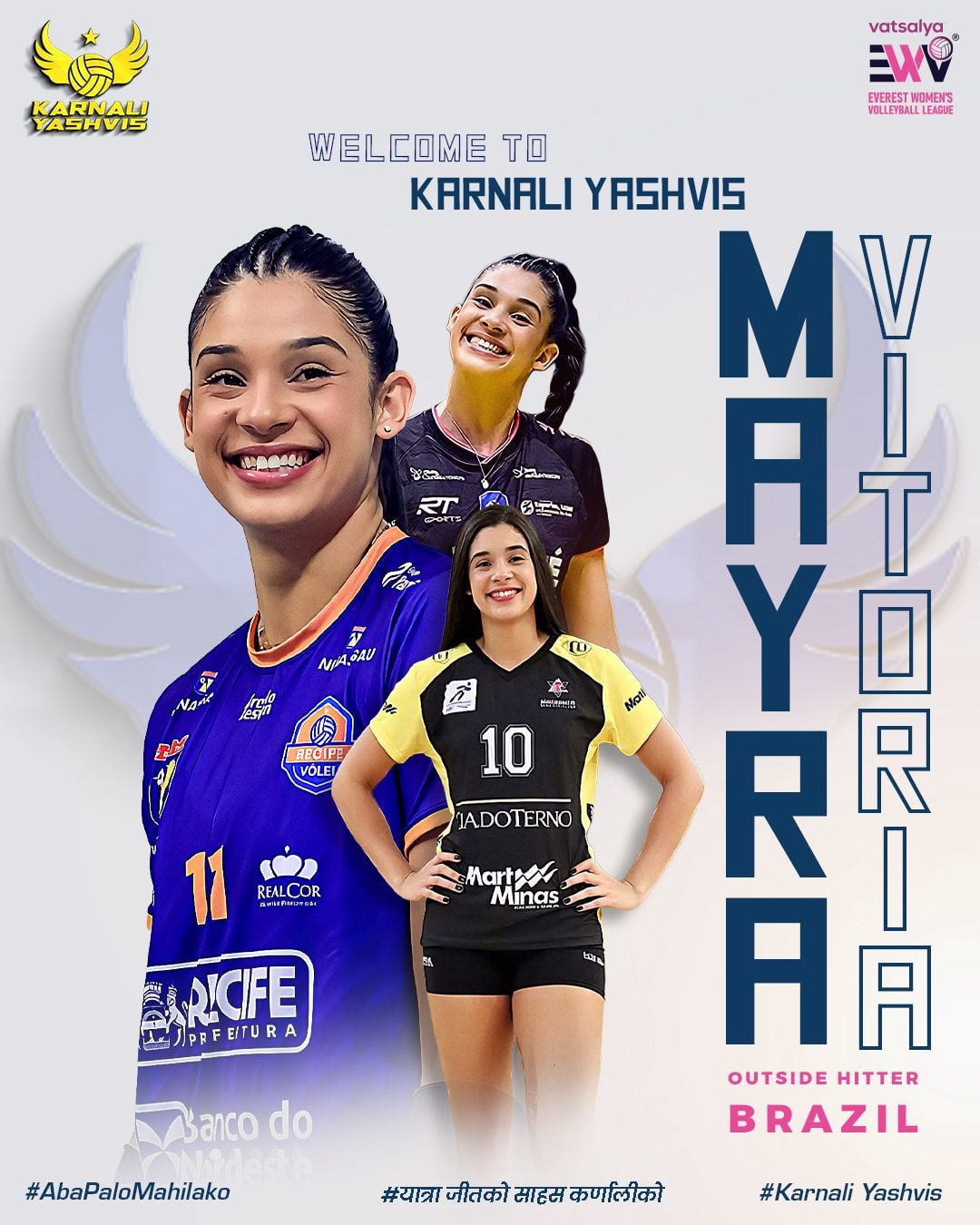 काठमाडौं । एभरेस्ट महिला भलिबल लिग (इडब्लुभिएल)को दोस्रो सिजनका लागि कर्णाली यशभिसले धमाधम विदेशी खेलाडी अनुबन्ध गरेको छ। ब्राजिलियन खेलाडी आना फ्लाभियालाई अनुबन्धित गरेको गरेको केही दिनभित्रै अर्की चर्चित ब्राजिलका महिला भलिबल खेलाडी मायरा भिटोरियालाई अनुबन्ध गरेको छ।