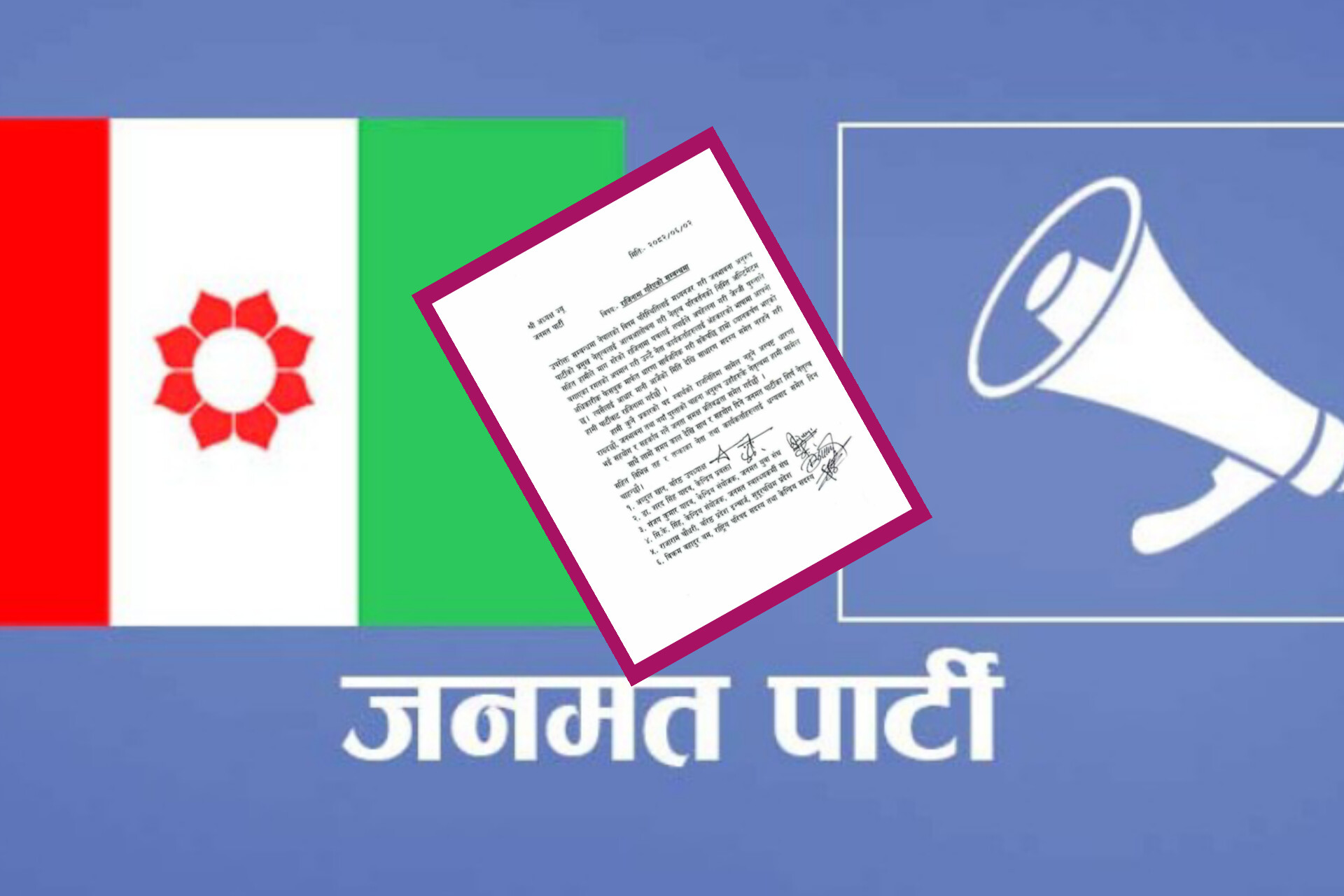 काठमाण्डौ. असोज —२ गते । जनमत पार्टीका आधा दर्जनौँ नेताहरुले अध्यक्ष सीके राउत र पार्टी शीर्ष नेतृत्वले देखिएको व्यवहारप्रति असन्तुष्टि जनाउँदै आजैबाट पार्टी छाड्ने घोषणा गरेका छन् । उनीहरुले सामुहिक राजीनामा दिदै साधारण सदस्य समेत नरहने घोषण गरेका हुन् ।