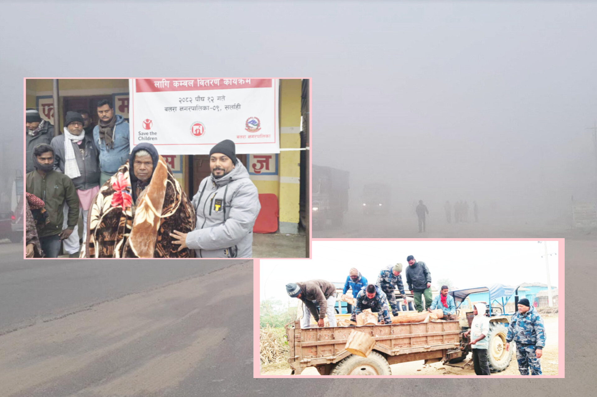 यता ईश्वरपुर नगरपालिकामा ग्रामीण नारी उत्थान संघ, हरिपुरले चिसो प्रभावित विपन्न तथा दलित परिवारलाई कम्बल वितरण गरेको छ । सेभ द चिल्ड्रेनको आर्थिक सहयोगमा संस्थाले हरिपुर र ईश्वरपुर नगरपालिकाका चिसो प्रभावित परिवारलाई कम्बल वितरण गरेको हो । ईश्वरपुर नगरपालिकाका वडा नं. १, ४, ७, १० र ११ मा शीतलहर प्रभावित परिवारलाई नगरप्रमुख मनोजकुमार आचार्यको प्रमुख आतिथ्यतामा ६८९ थान कम्बल वितरण गरिएको संस्थाले जनाएको छ । यसअघि हरिपुर नगरपालिकाका वडा नं. १, २, ४, ५, ७, ८ र ९ मा ५७६ थान कम्बल वितरण गरिएको पनि संस्थाले जानकारी दिएको छ ।