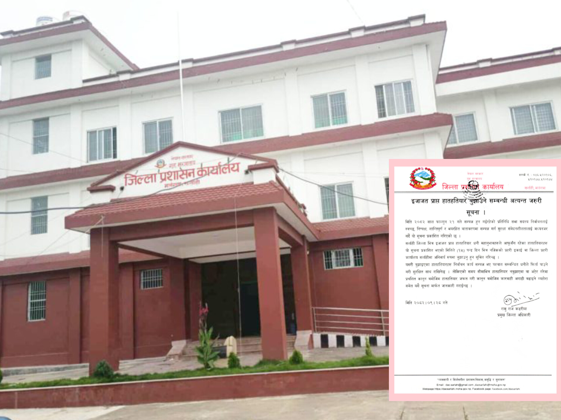 मलंगवा, पुस- २९ । प्रतिनिधि सभा सदस्य निर्वाचनलाई स्वच्छ, निष्पक्ष, शान्तिपूर्ण र भयरहित वातावरणमा सम्पन्न गर्न जिल्ला प्रशासन कार्यालय सर्लाहीले इजाजत प्राप्त हातहतियार बुझाउन जरुरी सूचना जारी गरि आग्रह गरेको छ।