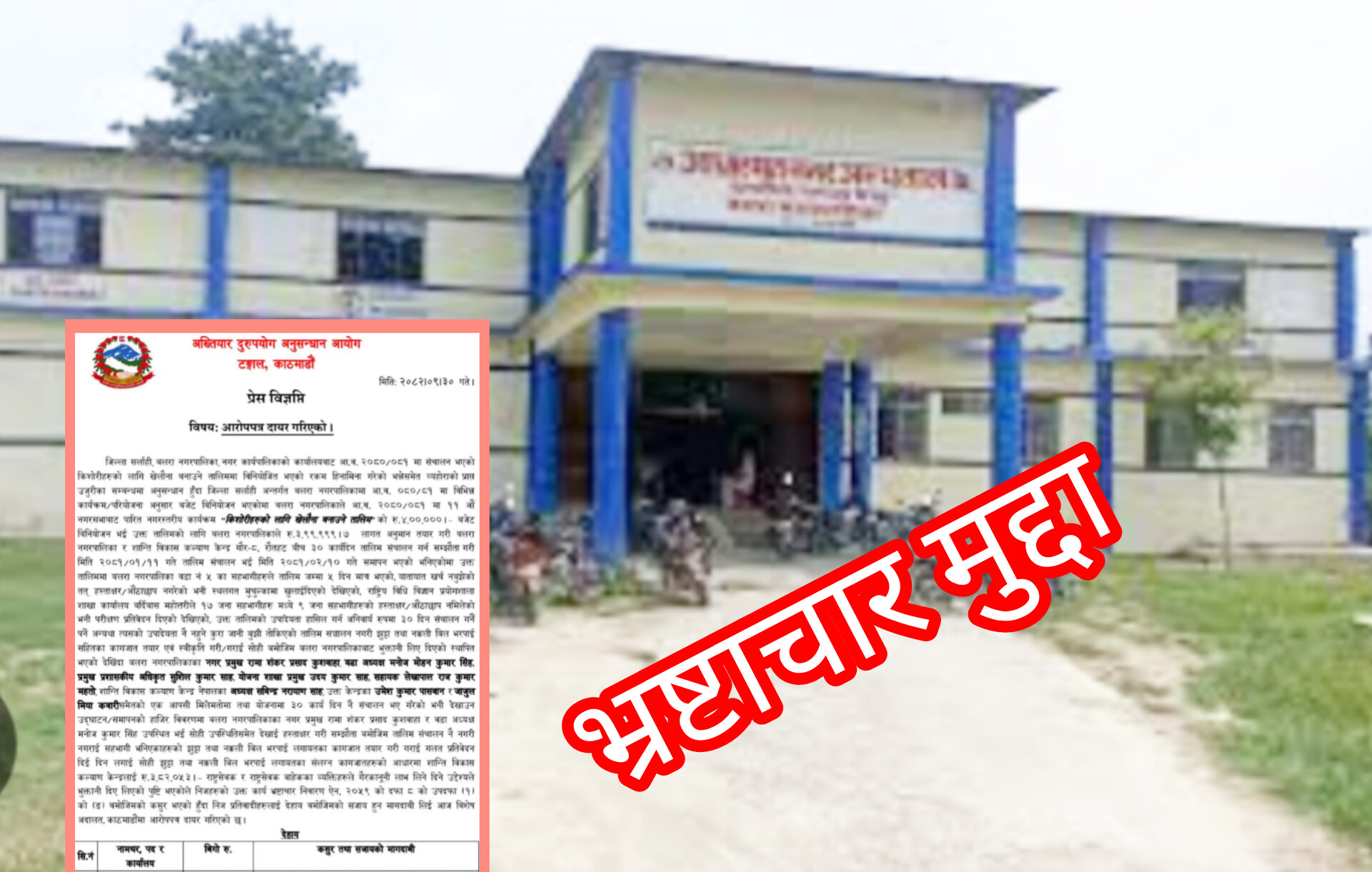 लालबन्दी,पुस—३० गते । अख्तियार दुरुपयोग अनुसन्धान आयोगले सर्लाहीको बलरा नगरपालिकामा किशोरीहरूका लागि सञ्चालन गरिएको भनिएको तालिममो रकम हिनामिना भएको ठहर गर्दै नगर प्रमुखसहित ८ जनाविरुद्ध विशेष अदालत, काठमाडौंमा आरोपपत्र दायर गरेको छ।
