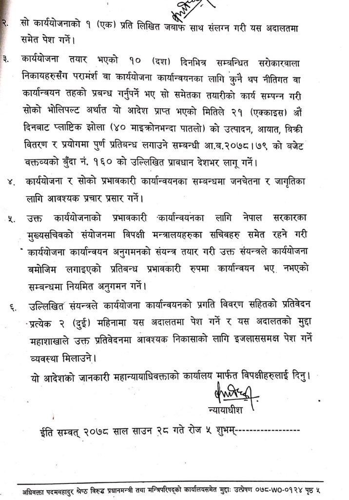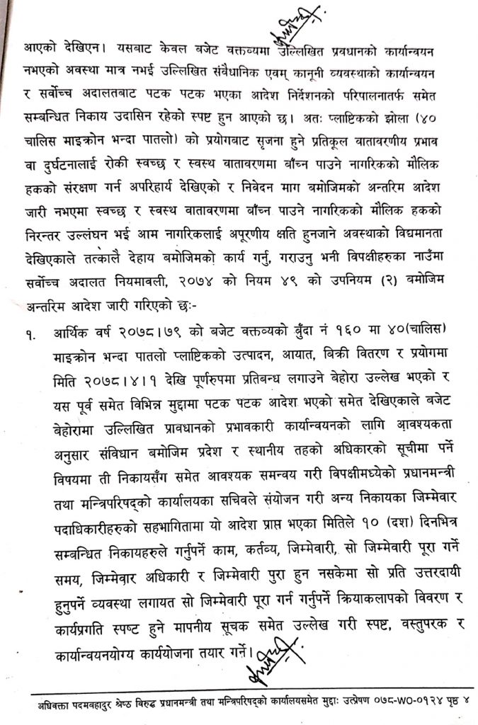 बजेट वक्तव्यमा साउन १ गतेदेखि ४० माइक्रोनभन्दा पातलो प्लास्टिकका झोला पूर्ण रुपमा प्रतिबन्ध लगाउने भनिएको र पटकपटक आदेश समेत भएको भन्दै अदालतले प्रभावकारी कार्यान्वयनका लागि १० दिनभित्र सम्बन्धित निकायले गर्नुपर्ने काम, कर्तव्य, जिम्मेवारीको कार्ययोजना बनाउन भनेको छ । चालिस माइक्रोन भन्दा पातलो प्लाष्टिकको झोला प्रयोगबाट सृजना हुने प्रतिकूल वातावरणीय प्रभाव वा दुर्घटनालाई रोकी स्वच्छ र स्वस्थ वातावरणमा बाँच्न पाउने नागरिकको मौलिक हकको संरक्षण गर्न अपरिहार्य देखिएको आदेशमा भनिएको छ । अदालतले आदेको तत्कालै कार्यन्वयन गर्नु, गराउन भनी विपक्षीहरुका नाउँमा अन्तरिम आदेश जारी गरिएको छ ।
