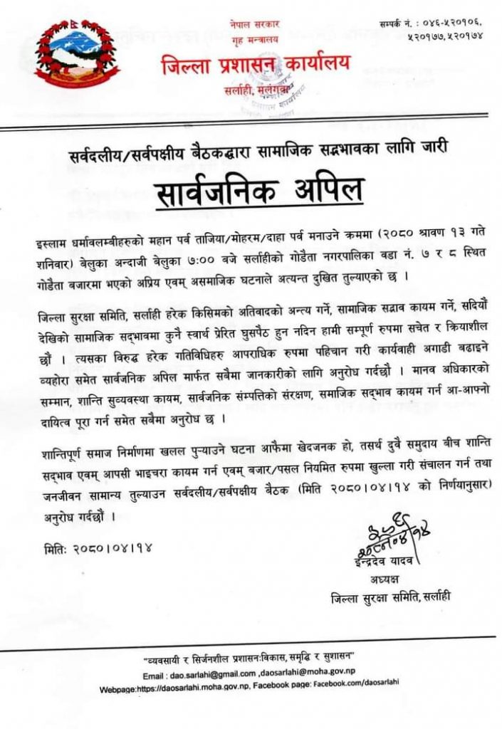 सर्लाही हरेक किसिमको अतिवादको अन्त्य गर्ने, सामाजिक सद्भाव कायम गर्ने, सदियौं देखिको सामाजिक सद्भावमा कुनै स्वार्थ प्रेरित घुसपैठ हुन नदिन हामी सम्पूर्ण रुपमा सचेत र क्रियाशील छौं, अपिलमा भनिएको छ ।