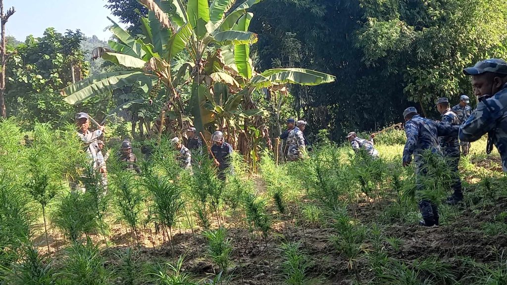 गाँजा फडानी गर्न नेपाल प्रहरी र सशस्त्र प्रहरीको संयुक्त टोली सहित स्थानीय प्रशासनका अधिकारीहरु नारायणखोला पुगेका थिए ।