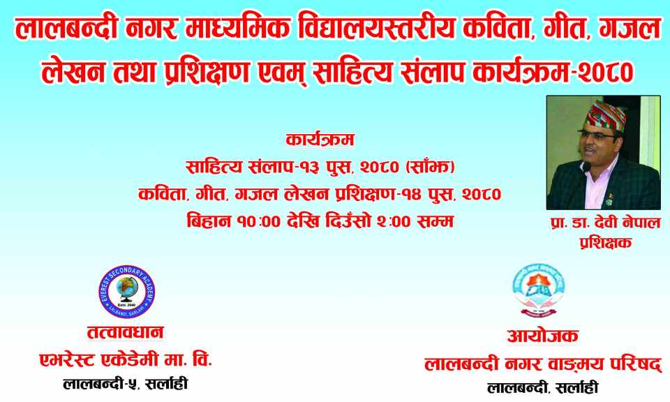 लालबन्दी, पुस- १२, लालबन्दी नगर वाङ्मय परिषद्ले सिर्जनात्मक लेखन तथा प्रशिक्षण कार्यक्रम गर्ने भएको छ। लालबन्दी नगर वाङ्मय परिषद्को ऐन, २०७७ बमोजिम स्थापित लालबन्दी नगर वाङ्मय परिषद्ले विभिन्न राष्ट्रिय तथा स्थानीय स्तरका साहित्यिक कार्यक्रम गर्दै आएको छ ।