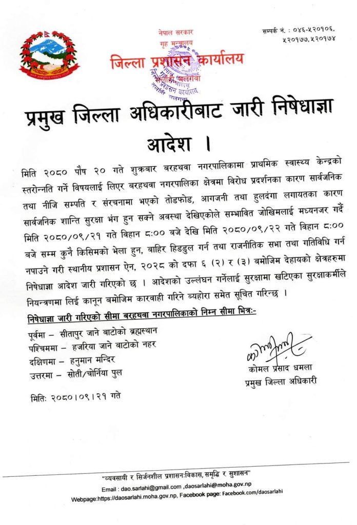 सर्लाही,पुस-२१,सर्लाहीका प्रमुख जिल्ला अधिकारी काेमल प्रसाद धमलाले बरहथवामा निषेधाज्ञा आदेश जारी गर्नुभएको छ ।