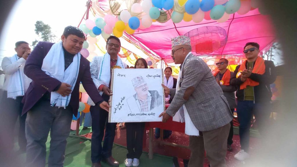 कार्यक्रममा विद्यालयका कक्षा ६ मा अध्ययनरत छात्रा लेसी वाईबाले काेरेकाे नगर प्रमुखको तस्बिर प्रमुख अतिथि बुढाथोकीलाईल प्रदान गरिएको थियो ।