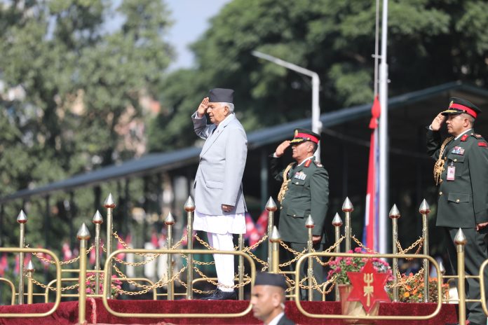 नेपाली सेनाले राष्ट्रपति पाैडेलकाे सम्मानमा सलामी अर्पण गरेकाे थियो ।